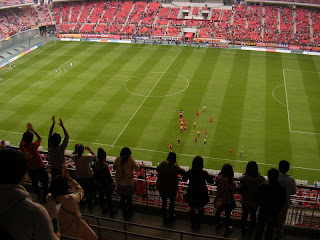 smiles from those in green. Across the pitch, you can see the slim floodlights